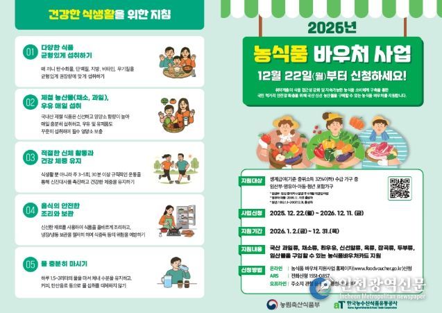 [인천광역신문] 박진 기자 | 농림축산식품부는 2026년 농식품 바우처 사업 신청이 2025년 12월 22일부터 시작된다고 밝혔다.