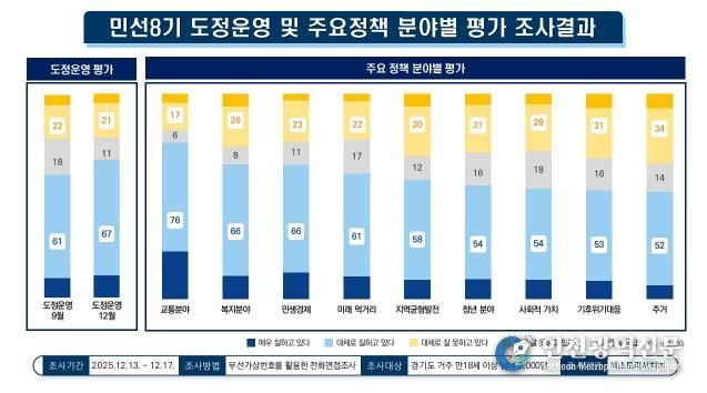 정책 분야별 평가 결과, 교통 분야 긍정 평가가 76%로 가장 높게 나타났으며, 민생경제와 복지 분야는 각각 66%, 미래먹거리 분야는 61%로 집계됐다. 지역균형발전 58%, 기후위기 대응과 청년 분야는 각각 54%, 사회적 가치 분야는 53%였으며, 주거 분야도 52%로 긍정 평가가 과반을 기록했다.