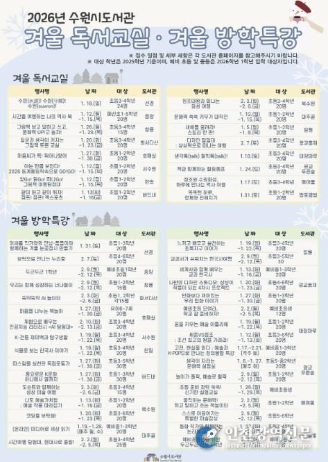 수원시도서관 관계자는 “겨울방학 동안 아이들이 책과 가까워지고 다양한 경험을 쌓을 수 있도록 프로그램을 준비했다”며 “도서관이 배움과 휴식이 공존하는 공간이 되길 바란다”고 말했다.