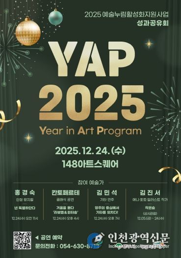 [인천광역신문] 박진 기자 | (재)영주문화관광재단은 오는 12월 24일 148아트스퀘어에서 크리스마스 컨셉의 ‘2025 예술누림활성화 지원사업 성과공유회 'YAP 2025'’를 개최할 예정이다.