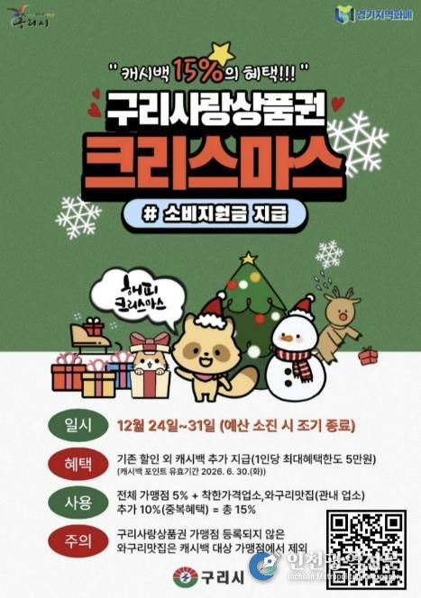 [인천광역신문] 박진 기자 | 구리시는 12월 24일부터 ‘구리사랑상품권 크리스마스 소비 지원금’을 지급한다고 밝혔다. 이번 소비 지원금은 연말연시 기간 지역 외로 유출되는 소비를 지역 내로 유도하고, 관내 상권 활성화와 소상공인 보호를 위해 마련됐으며, 예산 소진 시 조기 종료될 수 있다.