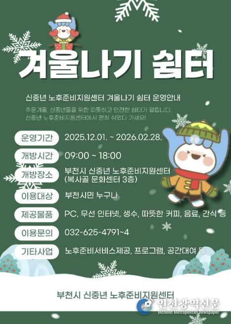 이소영 부천시 돌봄지원과장은 “겨울나기 쉼터는 시민들이 추위를 피해 따뜻하게 머물며 이웃과 자연스럽게 마주하고 소통할 수 있는 공간”이라며 “쉼터 이용이 노후준비 상담과 교육 등 다양한 서비스로 이어질 수 있도록 운영해 나가겠다”고 말했다.