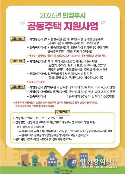 [인천광역신문] 박진 기자 | 의정부시는 노후 공동주택의 관리비용 부담 완화와 주거환경 개선을 위해 내년 1월 30일까지 ‘2026년 공동주택 지원사업’ 신청을 받는다.