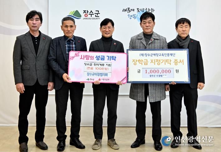 한편 장수군 이장협의회는 연말연시마다 장학금과 이웃돕기 성금 기탁을 지속해오고 있으며, 이번에 전달된 장학금은 학생들의 학업 지원에, 이웃돕기 성금은 관내 취약계층을 위한 복지사업에 활용될 예정이다.