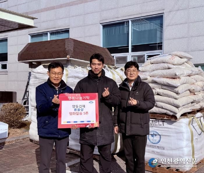 [인천광역신문] 박진 기자 | 양평군 양동면은 지난 19일 양동건재 류용상 씨가 양동면사무소를 방문해 겨울철 제설작업에 사용될 염화칼슘 5톤을 기탁하며 지역사회 안전과 이웃사랑 실천에 동참했다고 밝혔다.