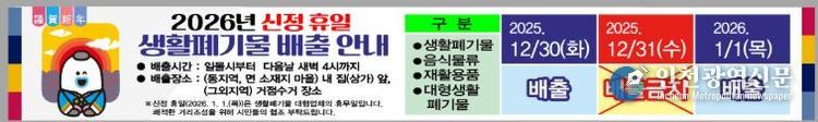 [인천광역신문] 박진 기자 | 거제시는 내년 1월 1일, 신정 휴일에는 생활폐기물 수거 대행업체의 휴무가 시행됨에 따라 일반생활·음식·재활용, 대형 생활폐기물이 수거되지 않는다고 밝혔다.