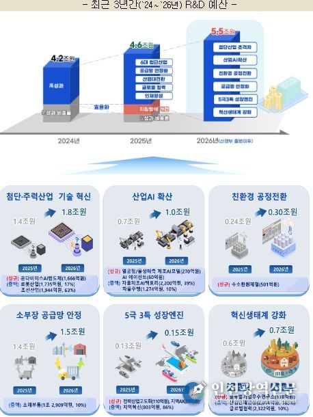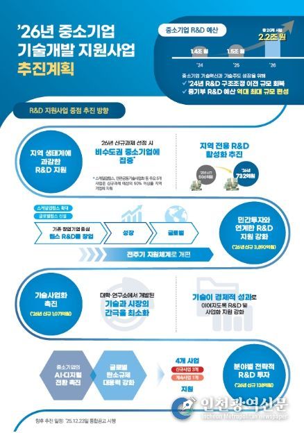 [인천광역신문] 박진 기자 | 중소벤처기업부와 산업통상부는 양 부처가 추진하는 R&D사업의 지원내용·대상·절차·일정 등을 담은 ‘26년도 R&D사업 통합시행계획’을 함께 공고한다고 밝혔다.