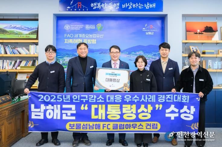 [인천광역신문] 박진 기자 | 남해군이 행정안전부가 주관한 ‘2025년 지자체 인구감소 대응 우수사례 경진대회’에서 최고 우수 기초지자체로 선정돼 대통령상을 수상하는 영예를 안았다.