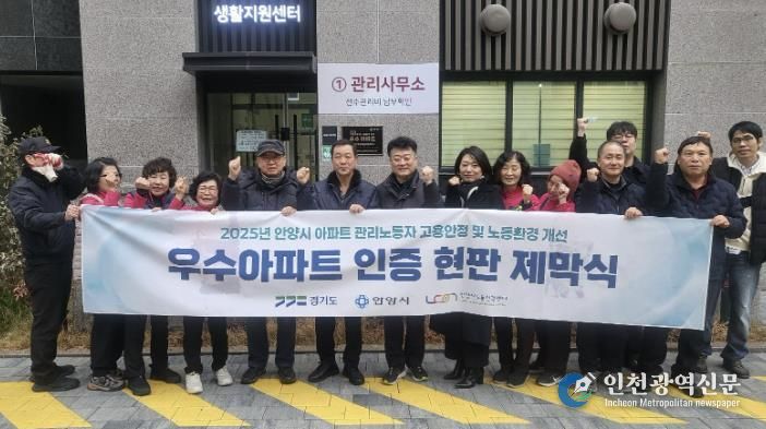 [인천광역신문] 박진 기자 | 안양시노동인권센터는 지난 20일 ‘2025년 고용안정 및 노동환경 개선 우수아파트’로 선정된 래미안안양메가트리아와 힐스테이트인덕원역베르텍스 아파트에서 ‘우수아파트 인증 현판식’을 진행했다고 23일 밝혔다.