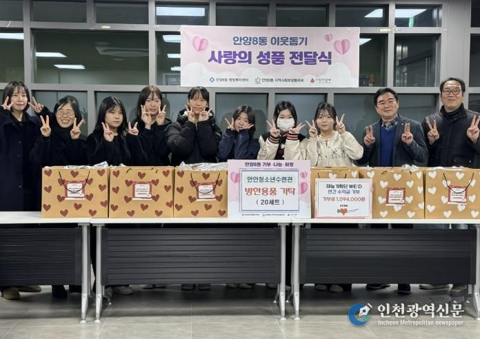 [인천광역신문] 박진 기자 | 안양시 만안구 안양8동 행정복지센터에 따르면 지난 18일 만안청소년수련관의 청소년 자치활동 프로그램 ‘재능기획단’이 관내 혼자 생활하는 어르신들에게 전달해달라며 센터에 1,094,000원 상당의 방한용품 20세트를 기탁했다고 23일 밝혔다.