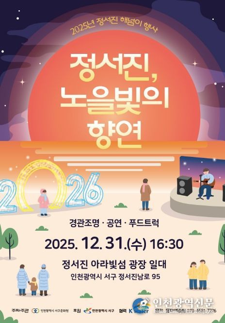 강범석 서구청장은 “우리 구의 대표적인 노을 명소인 정서진을 찾은 구민과 관광객들이 아름다운 노을과 공연을 함께 즐기며 한 해의 마지막 순간을 따뜻하게 기억하시길 바란다”라며 “각자의 바람과 희망을 담아 2026년을 힘차게 시작하는 계기가 되길 기대한다”라고 말했다.