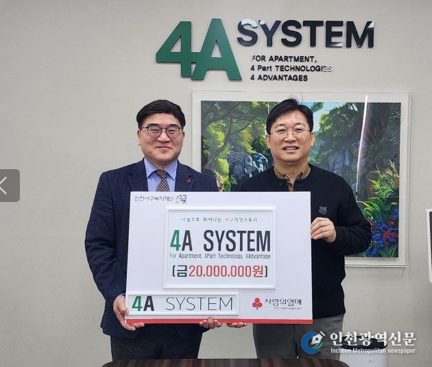[인천광역신문] 박진 기자 | (주)포에이시스템(대표 김소중)은 지난 22일 인천서구복지재단(이사장 강범석)에 취약계층을 위한 지원사업을 위하여 2천만 원을 기탁했다.