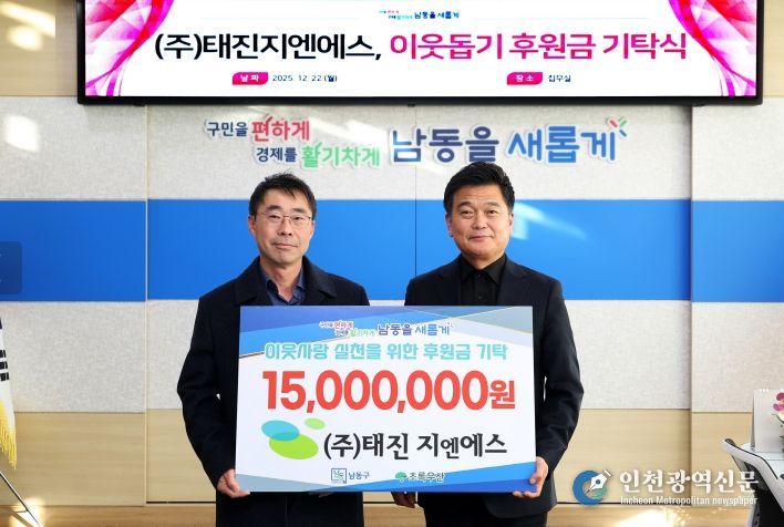 [인천광역신문] 박진 기자 | 인천시 남동구는 주식회사 태진지엔에스(대표이사 김희태)로부터 취약계층 아동 학업 증진과 재능 계발을 위한 후원금 1,500만 원을 기탁받았다고 23일 전했다.