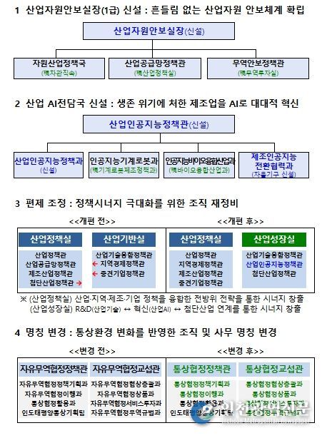 이번 조직개편은 국민주권정부 국정과제의 속도감 있는 이행을 위한 조직 기능 강화와 에너지기능 분리 이후 자원산업 재배치, 지역 성장 및 기업 활력 제고 등 정책시너지 창출을 위한 조직 재정비 차원에서 마련됐다.