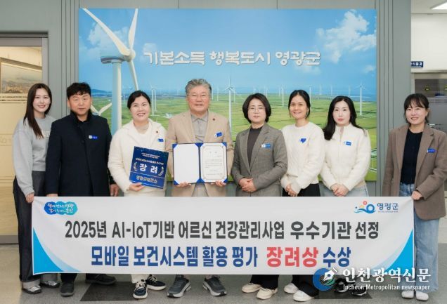 [인천광역신문] 박진 기자 | 영광군은 12월 18일 한국사회보장정보원 주관으로 서울PJ호텔에서 열린 2025년 AI-IoT기반 어르신 건강관리사업 모바일 보건소 시스템 활용 평가 성과대회에서 장려상을 수상하며 2년 연속 우수기관으로 선정됐다.