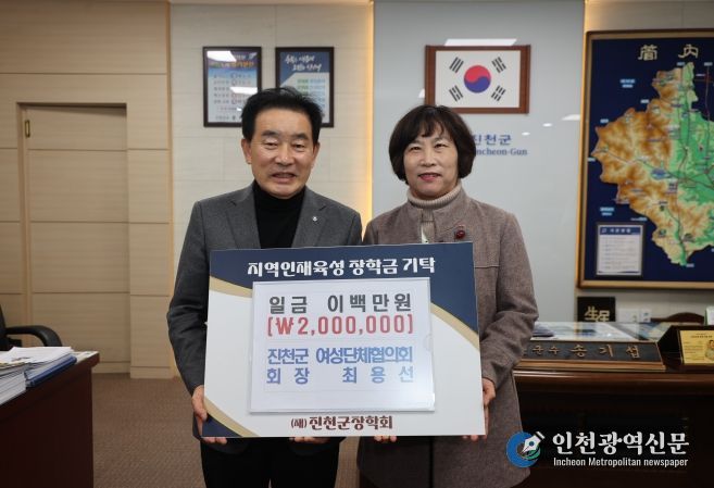 [인천광역신문] 박진 기자 | 충북 진천군 여성단체협의회(회장 최용선)는 23일 (재)진천군장학회를 방문해 지역 인재 육성을 위해 써달라며 장학금 200만원을 기탁했다.