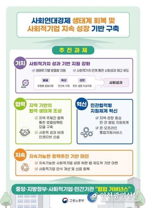 [인천광역신문] 박진 기자 | 고용노동부는 가치, 협력, 혁신, 지속가능성을 기본전략으로 제시하고 사회적기업 생태계 회복과 지속가능한 성장 기반 구축에 본격적으로 나선다.