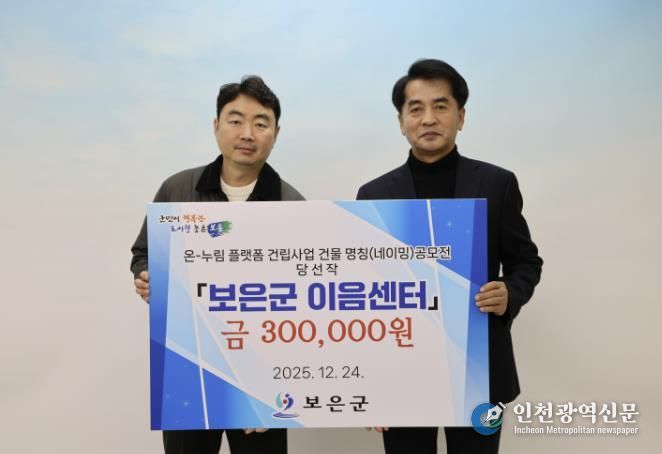[인천광역신문] 박진 기자 | 충북 보은군은 생애주기별 복지서비스 제공을 위한 ‘온-누림 플랫폼(가칭)’의 공식 명칭으로 ‘보은군 이음센터(응모자 박준표)’를 최종 선정하고 24일 시상식을 개최했다.