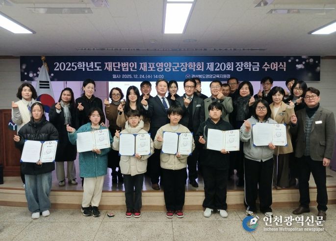 [인천광역신문] 박진 기자 | 경상북도영양교육지원청은 12월 24일 관내 초등학교 6명을 대상으로 재단법인 재포영양군장학회가 주관하는 2025학년도 재단법인 재포영양군장학회 제20회 장학금 수여식을 영양교육지원청 3층 대회의실에서 실시했다.