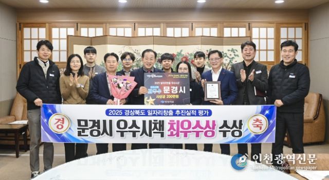 [인천광역신문] 박진 기자 | 문경시는 23일 안동 그랜드호텔에서 열린 ‘2025년 경상북도 일자리창출 추진실적 평가’에서 작년에 이어 2년 연속 우수시책 부문 최우수상을 수상하는 쾌거를 올렸다.