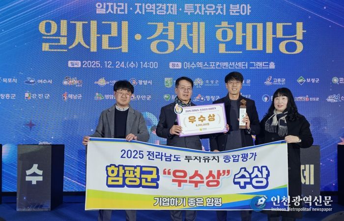 군 관계자는 “이번 수상은 열악한 투자 여건 속에서도 기업 유치를 위해 힘써 온 공직자들의 노력과, 함평을 믿고 투자해 준 기업들의 협력이 함께 이뤄낸 성과”라며 “앞으로도 ‘기업하기 좋은 함평’을 목표로, 지역 산업 경쟁력 강화와 양질의 일자리 창출을 위한 투자유치 활동을 지속해 나가겠다”고 말했다.