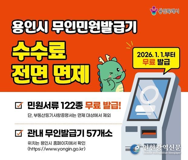 [인천광역신문] 박진 기자 | 용인특례시는 2026년 1월 1일부터 지역 내 설치된 무인민원발급기에서 발급되는 민원서류 수수료를 전면 면제한다고 25일 밝혔다.