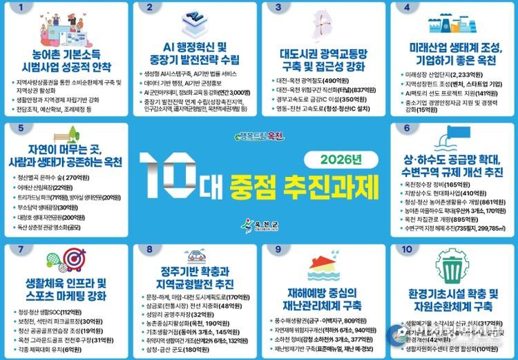 [인천광역신문] 박진 기자 | 옥천군이 26일 2026년 군정 운영의 핵심 방향을 담은 10대 중점 추진과제를 발표하고, 군민 삶의 질 향상과 지속가능한 지역성장을 위한 정책 추진에 나선다.