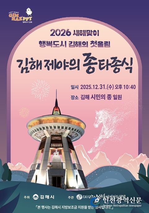 [인천광역신문] 박진 기자 | 김해시는 ‘2025 김해 제야의 종 타종식’을 오는 31일 오후 10시40분부터 2026년 1월 1일 0시 30분까지 김해시민의 종 일원에서 개최한다고 26일 밝혔다.