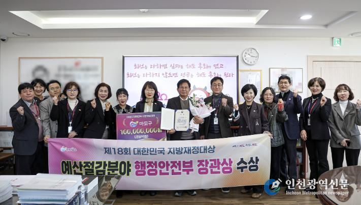 [인천광역신문] 박진 기자 | 마포구는 12월 17일, 행정안전부가 주관한 ‘제18회 대한민국 지방재정대상’에서 예산절감 분야 행정안전부 장관상을 수상하고 인센티브로 특별교부세 1억 원을 확보했다.