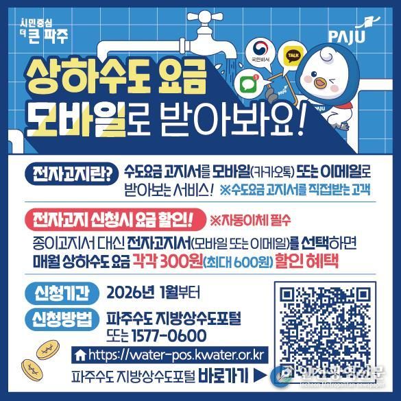 [인천광역신문] 박진 기자 | 파주시는 2026년 1월부터 수도요금 전자고지와 자동납부를 동시에 신청하는 시민에게 수도요금을 할인하는 제도를 시행한다고 밝혔다.