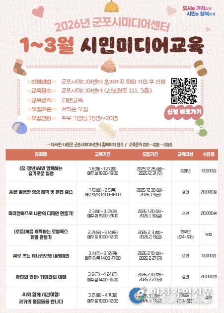 [인천광역신문] 박진 기자 | 군포시미디어센터는 시민들의 미디어 활용 역량 강화를 위해 2026년 1분기 미디어교육 프로그램 수강생을 모집한다.
