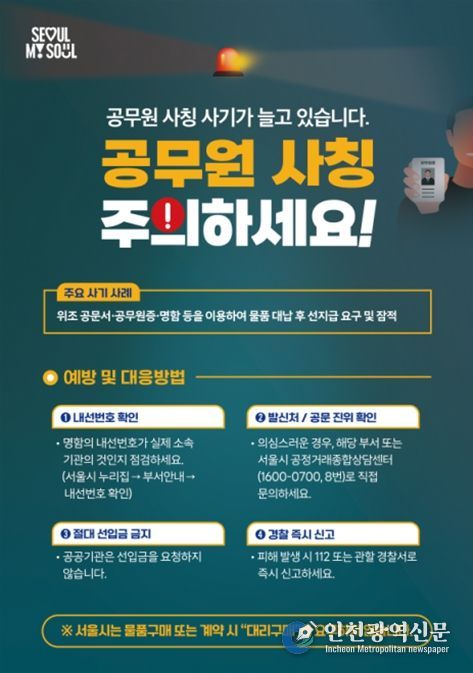 [인천광역신문] 박진 기자 | 서울시는 최근 중·소상공인을 대상으로 공무원 사칭 사기 피해가 끊이지 않고 발생하고 있어, 서울시공정거래종합상담센터 내 ‘공무원 사칭 사기 피해 신고센터’를 설치하고 적극 대응에 나선다.