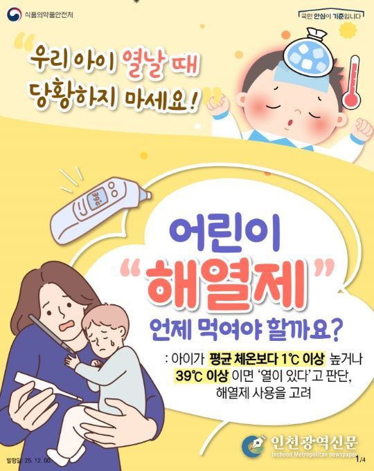 [인천광역신문] 박진 기자 | 식품의약품안전처 소속 식품의약품안전평가원(원장 강석연)은 겨울철에는 고열이 동반된 감기 및 독감 환자의 해열제 사용이 늘어남에 따라, 소아 해열제의 올바른 사용방법을 안내한다고 밝혔다.