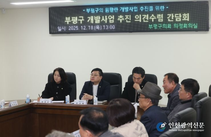[인천광역신문] 박진 기자 | 부평구의회는 지난 18일 의정회의실에서 허정미(더불어민주당, 삼산2, 부개2ㆍ3동), 윤구영(국민의힘, 삼산2, 부개2ㆍ3동), 박영훈 의원(더불어민주당, 부평3동, 산곡3ㆍ4동, 십정1ㆍ2동)과 함께 ‘부평구 개발사업 추진을 위한 의견수렴 간담회’를 개최했다고 밝혔다.