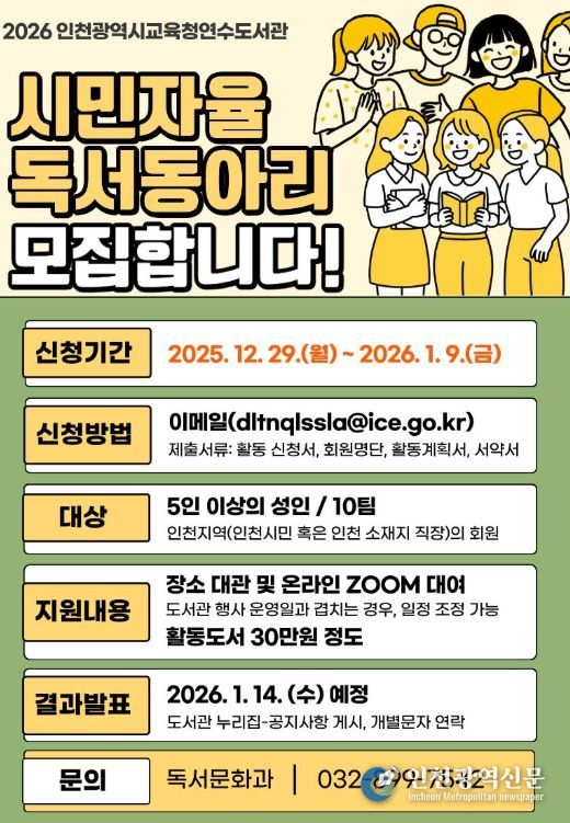 [인천광역신문] 박진 기자 | 인천광역시교육청연수도서관은 시민의 자발적인 독서활동을 지원하고 독서생활화를 확산하기 위해 ‘2026년 시민자율독서동아리’를 모집한다.