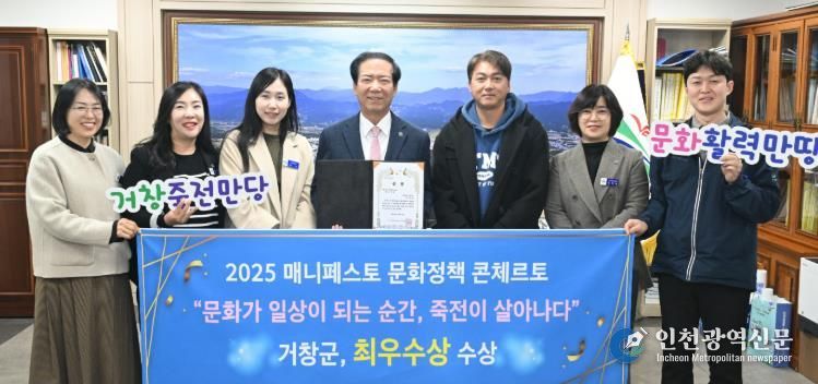 [인천광역신문] 박진 기자 | 거창군은 강원특별자치도 원주시 상지대학교에서 개최한 ‘2025 전국 기초단체장 매니페스토 문화정책 콘체르토(Concerto)’ 대회에서 문화기반 도시활력분야 ‘최우수상’을 수상했다고 26일 밝혔다.