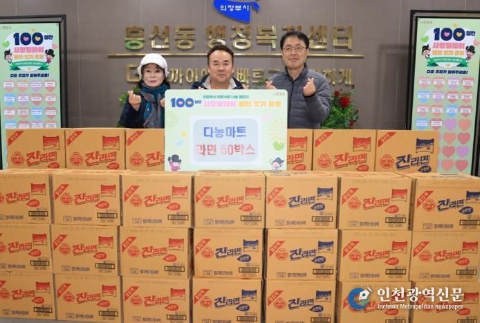 [인천광역신문] 박진 기자 | 의정부시 흥선동행정복지센터는 12월 24일 다농마트가 ‘100일간 사랑릴레이 배턴 잇기’에 동참해 라면 50상자를 기탁했다고 밝혔다.