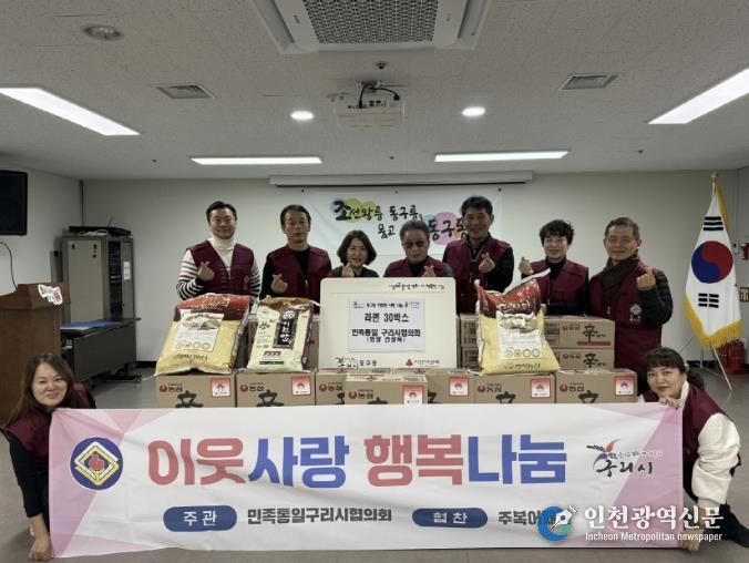 전상복 민족통일 구리시협의회 회장은 “본격적인 추위와 연말을 앞두고 우리 주변의 어려운 이웃들에게 작은 위로와 희망이 되기를 바라는 마음으로 회원들과 뜻을 모았다”라며 “앞으로도 지역사회에 관한 관심을 바탕으로 지속적인 나눔 활동을 이어가겠다”라고 말했다.