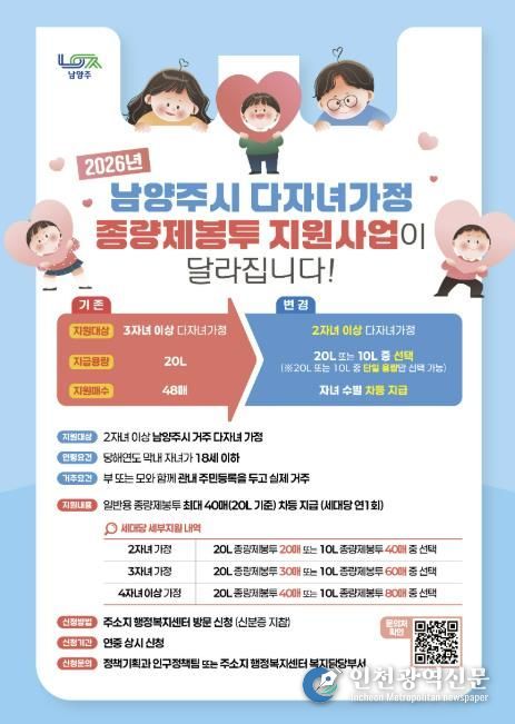 [인천광역신문] 박진 기자 | 남양주시는 내년 1월부터 ‘다자녀가정 종량제봉투 지원사업’ 대상을 2자녀 이상 가정으로 확대 운영한다고 26일 밝혔다.