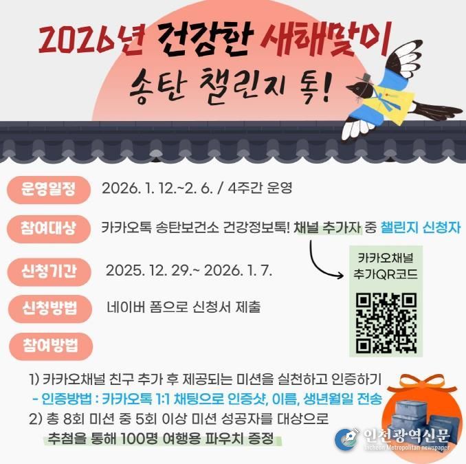 [인천광역신문] 박진 기자 | 평택시 송탄보건소는 12월 29일부터 2026년 1월 7일까지 건강한 새해맞이 ‘송탄 챌린지 톡!’1차 참여자를 모집한다고 밝혔다.