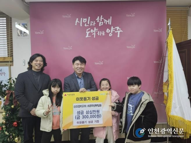 [인천광역신문] 박진 기자 | 양주시 남면 신산감리교회 초등부 4학년반 학생들은 지난 23일 남면 행정복지센터를 방문해 이웃돕기 성금을 전달하며 이웃사랑 실천에 앞장섰다.