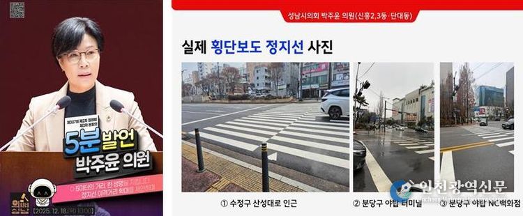 [인천광역신문] 박진 기자 | 성남시의회 박주윤 의원(국민의힘, 신흥2·3동·단대동)은 12월 18일 열린 제307회 성남시의회 제3차 본회의 5분 발언에서 보행자의 생명과 직결된 ‘횡단보도 정지선 이격거리 확대 설치’의 시급성을 강조하며, 성남시의 적극적인 개선책 마련을 촉구했다.