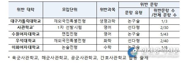 대구가톨릭대학교는 생명과학 1문항, 사관학교는 영어 2문항, 수원여자대학교는 영어 5문항, 우석대학교는 화학 2문항, 이화여자대학교는 수학 1문항이 고등학교 교육과정 범위를 위반한 것으로 나타났다. 위반 문항 비율은 대학별고사를 시행한 전체 대학의 문항 중 0.3%였다.