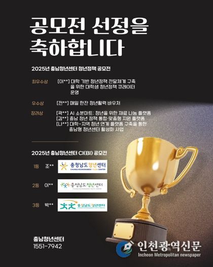 [인천광역신문] 박진 기자 | 충청남도는 도정에 반영 가능한 우수 청년정책을 발굴하기 위해 추진한 '2025년 충청남도 청년정책 공모전' 심사를 마무리하고, 총 5건의 수상작을 선정했다고 밝혔다.