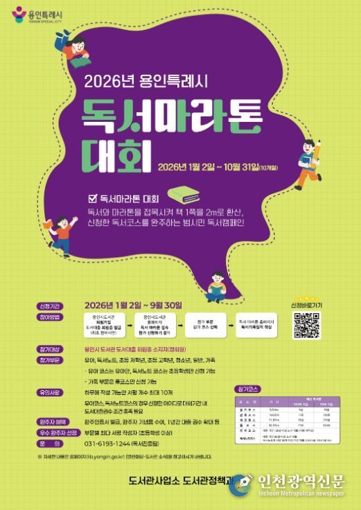 [인천광역신문] 박진 기자 | 용인특례시는 독서 장려 프로그램인 '독서마라톤 대회'를 내년 1월 2일부터 10월 31일까지 약 10개월간 진행한다고 28일 밝혔다.