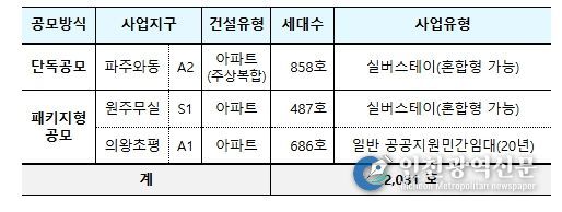 ②택지공모는 약 2천호 규모로 실시하며, 사업 대상지는 파주와동 A2 블록, 원주무실 S1 블록, 의왕초평 A1 블록 총 3곳이다. 파주와동 A2 블록과 원주무실 S1 블록은 실버스테이로, 의왕초평 A1 블록은 임대의무기간이 20년인 일반 공공지원민간임대로 공급한다.