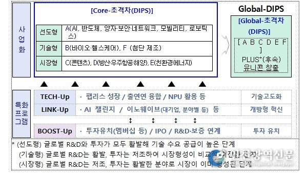 「초격차 프로젝트」는 기본지원(Core-DIPS)과 후속지원(Global DIPS) 등 2단계로 나누어 지원하며, 기술고도화(Tech Up), 개방형 혁신(Link Up),