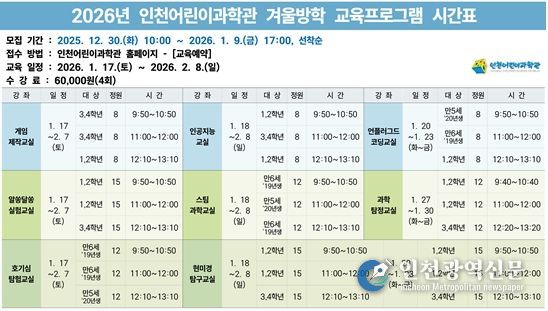 [인천광역신문] 박진 기자 | 인천시설공단 인천어린이과학관은 겨울방학을 맞이해 어린이들의 과학적 탐구 능력을 증진할 수 있는 '2026년 겨울방학 교육프로그램'을 내달 17일부터 2월 8일까지 운영한다.
