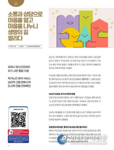 [인천광역신문] 박진 기자 | 김제시정신건강복지센터(센터장 서정수)는 시에서 추진 중인‘지역맞춤형 자살예방사업’이 지방자치단체 정책 전문지인 월간 「지방정부」 2025년 12월호에 지자체 우수사례로 소개됐다고 밝혔다.