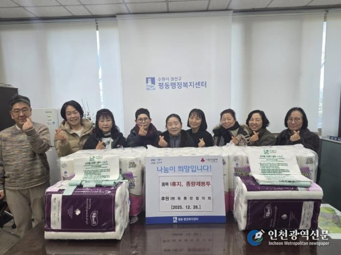 [인천광역신문] 박진 기자 | 수원시 권선구 평동 통장협의회는 주민들과 함께 수거한 종이팩으로 교환받은 휴지와 종량제봉투를 전량 기부하며 따뜻한 나눔을 실천했다.
